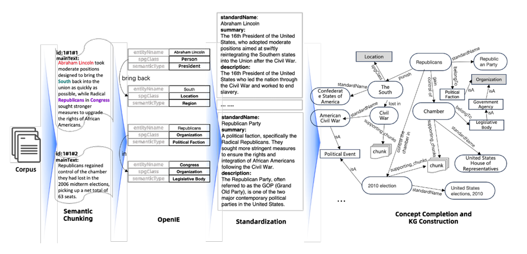 用 LLM(如 GPT-3.5、DeepSeek)或微调模型 Hum,从每个 Chunk 中提取实体、事件、关系,构建 KG_fr 实例,同时给每个实例的supporting_chunks属性赋值为 “当前 Chunk 的 ID”—— 这是 “KG→文本块” 关联的关键一步。